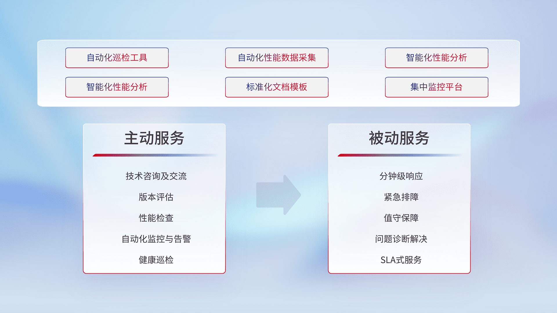 智能化工具和标准化文档,,保障服务质量,,,,提供主动服务(包含技术咨询、、版本评估、、、性能检查、、、自动化监控与告警、、、健康巡检)和被动服务包含(分钟级响应、、紧急排障、、值守保障、、、、问题诊断解决、、SLA服务)。。。