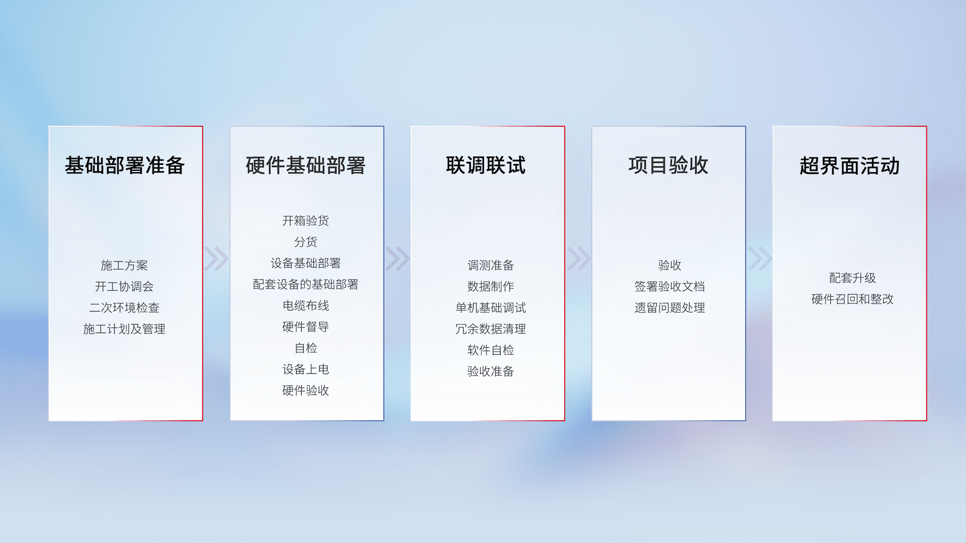 从基础部署准备、、、硬件基础部署、、、联调联试、、项目验收、、、、越界面活动的全过程可追溯,,,,保证施工质量和进度。。